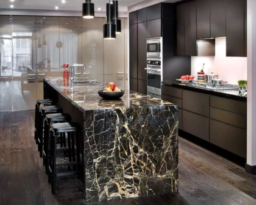 Домашняя барная стойка может быть расположена в гостиной, кухне и даже рабочем кабинете. С ее помощью зонируют пространство, увеличивают рабочую поверхность для приготовления блюд. Изготавливается различных размеров, форм, цветов и текстур из искусственного камня.