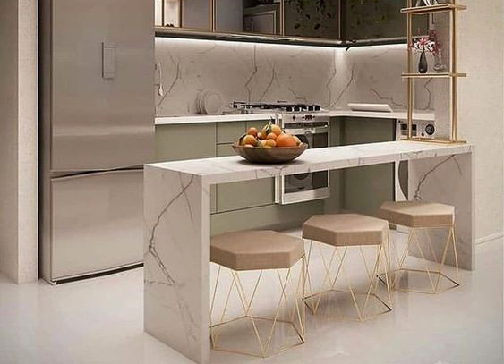 Барная стойка в маленькой гостиной заменяет обеденный стол, может служить рабочей поверхностью для приготовления коктейльных напитков. Выполненная из искусственного камня конструкция не подвержена негативному влиянию влаги, УФ-лучей, устойчива к воздействию множества химических средств.