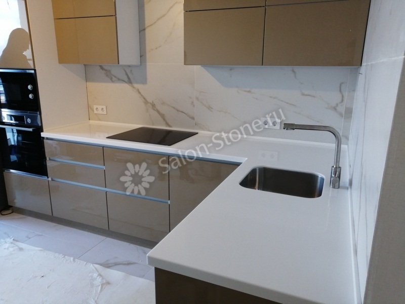 Белая угловая столешница для кухни из камня Staron